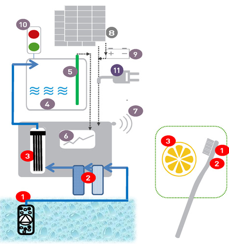 For maintenance we need a lemon and and a (tooth)-brush, nothing more. The lemon is for cleaning the disinfection cell, about every 4 weeks. The brush is for cleaning the filters.